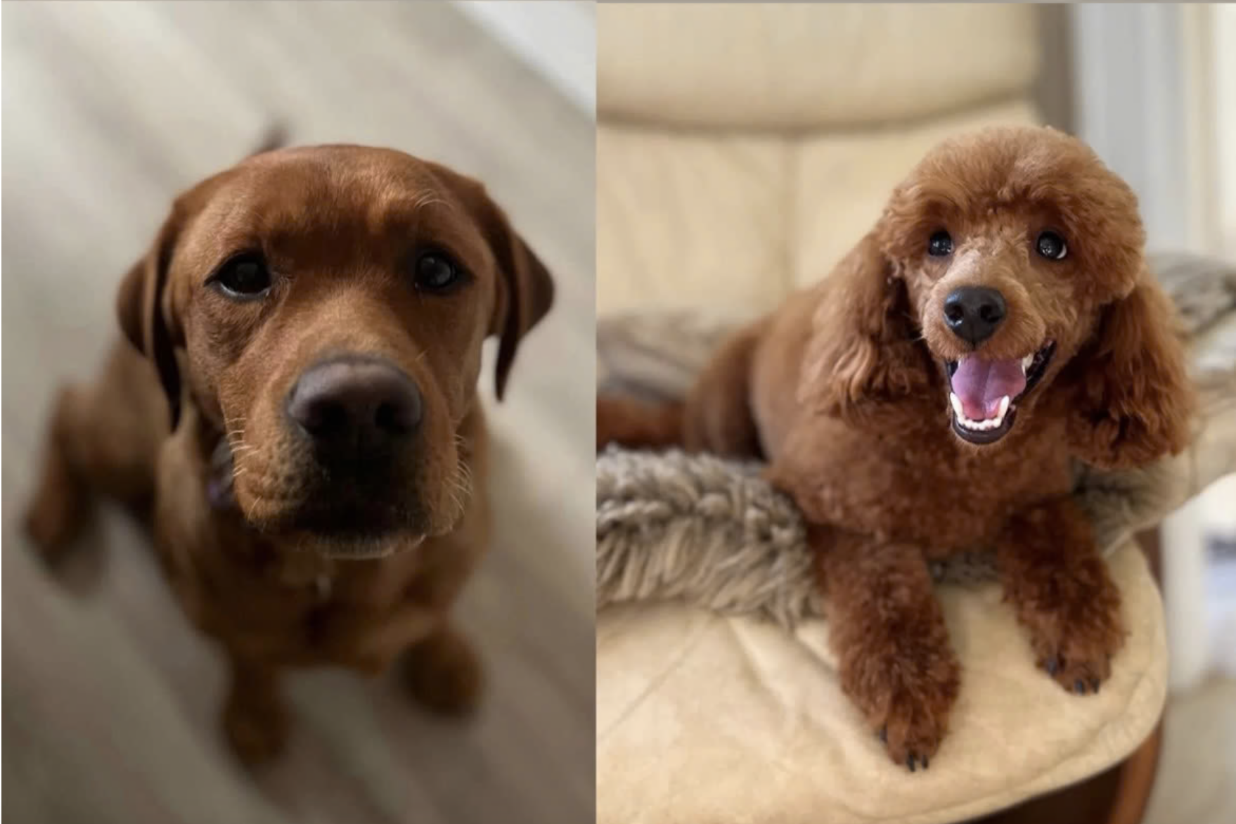 Hundemor er en imponerende smuk, dyb rød Labrador med et harmonisk og kærligt temperament. Hundefar er en elegant rød dværgpuddel med enestående udtryk, intelligens og charme. Sammen forventes de at give hvalpe med et helt særligt udseende og et fantastisk sind.